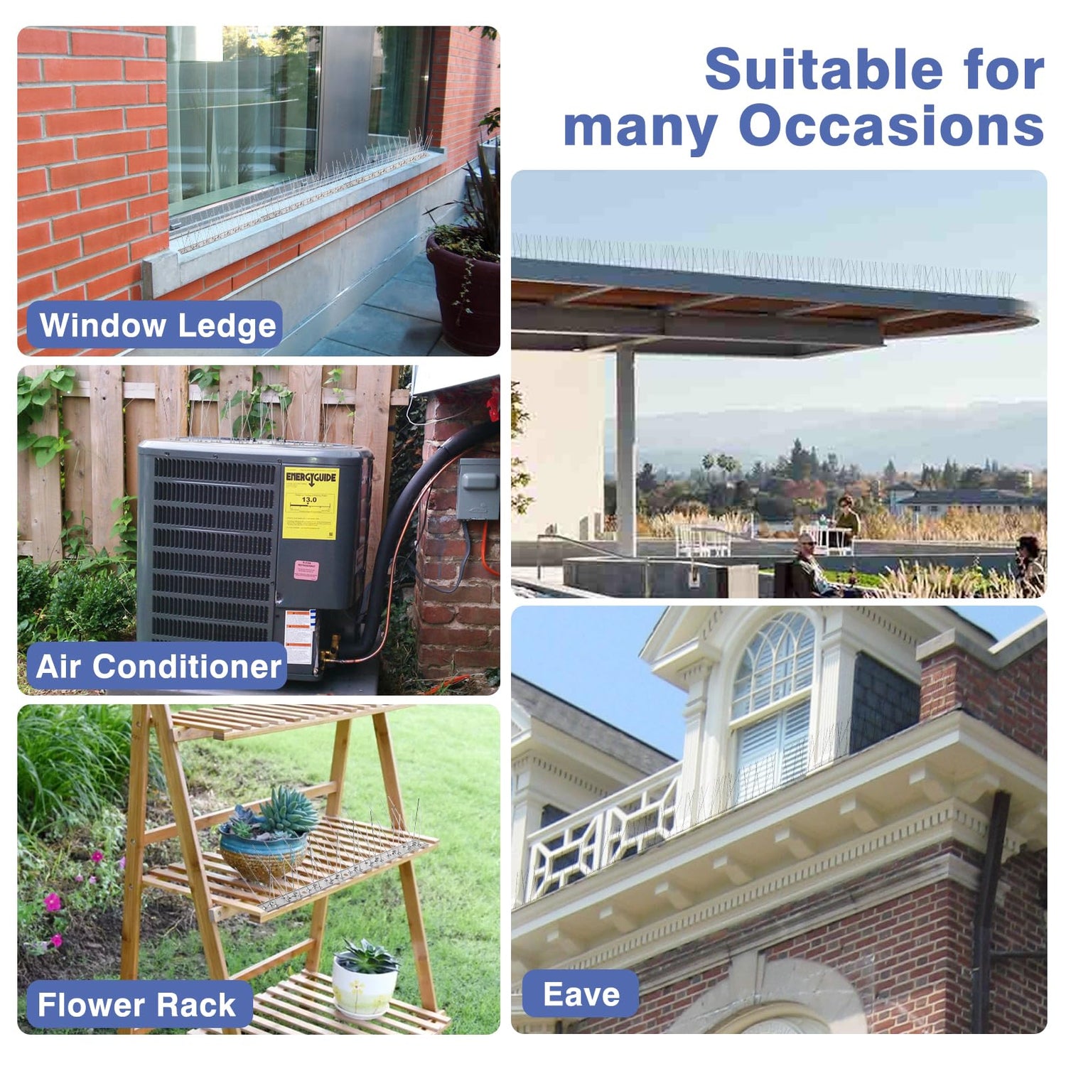 - Easy to Install and Assemble: Bird deterrent devices with stainless steel base and pre-drilled holes,simply insert the bird spikes into the base and fix with cable ties, screws, double-sided tape, etc. The package includes 6 nylon cable ties and 6 screws.