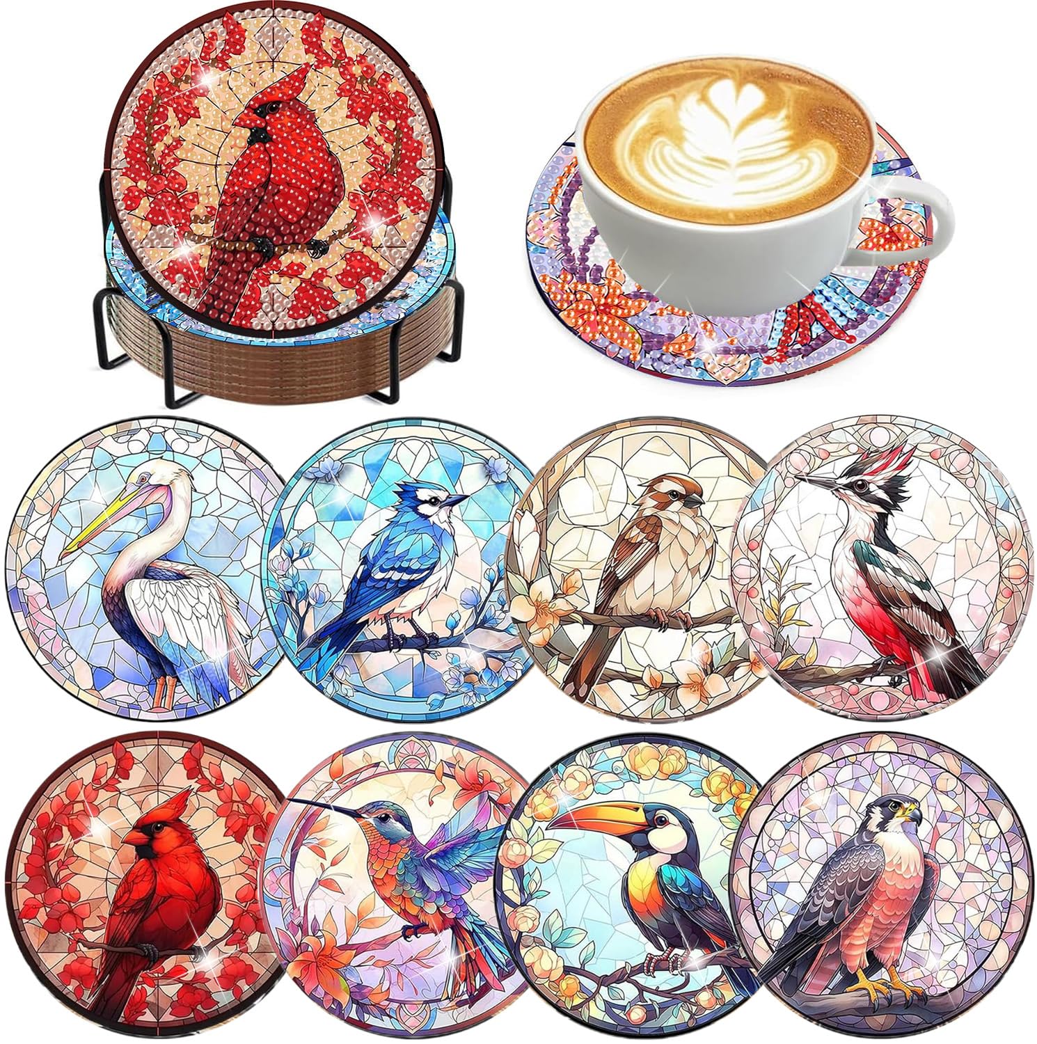 • 【Birds Diamond Art Coasters】: You will get 8 art coasters, 1 coaster holder, 1 diamond pen, 1 diamond tray, 1 clay glue and enough number of molded diamonds for a cute and shiny home decor