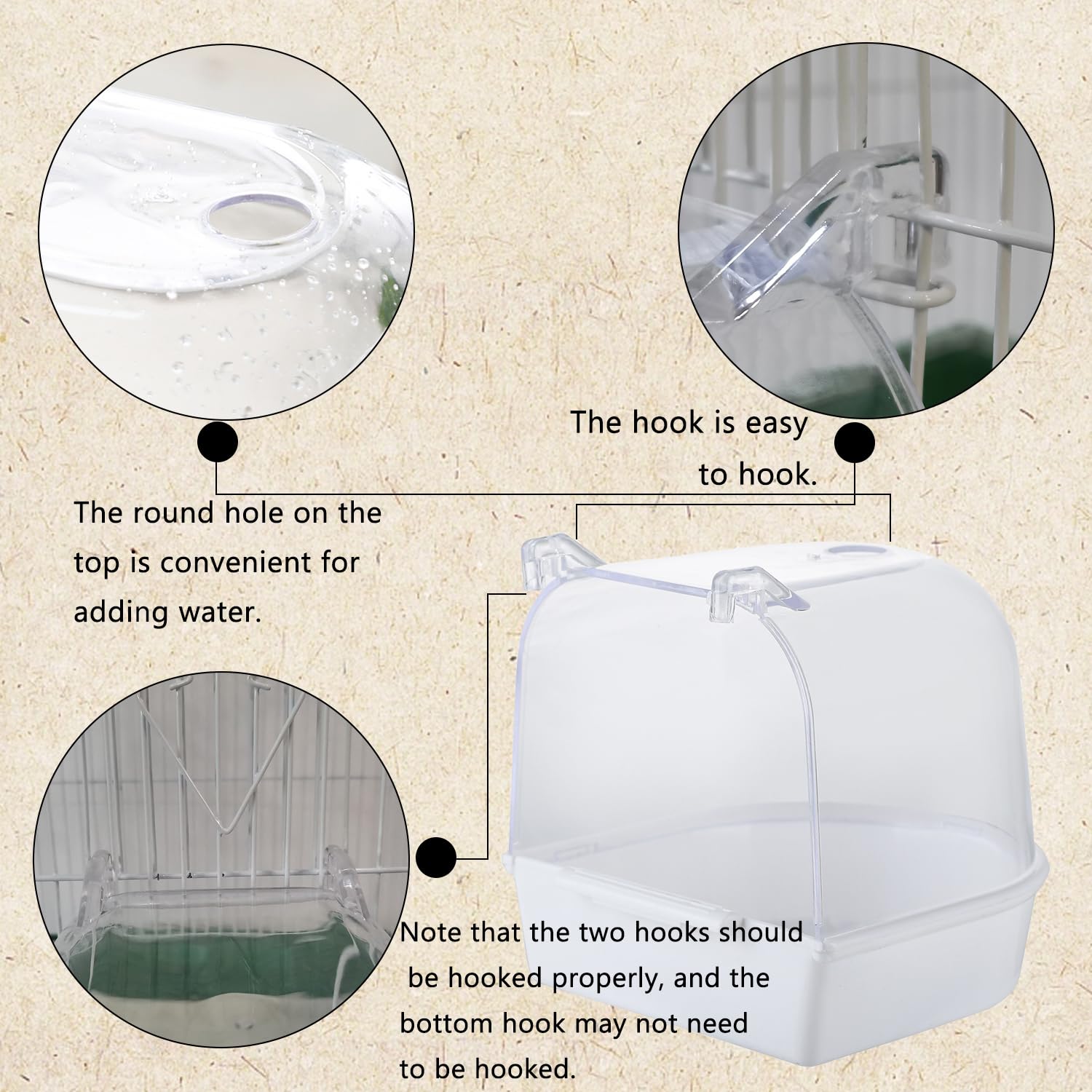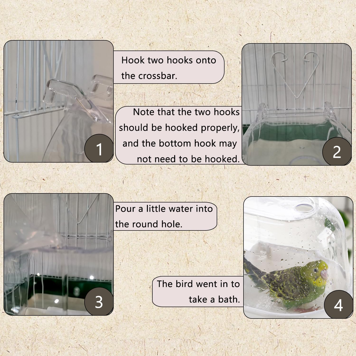 - Easy to clean – The universal clips fit most cage. Easy to hang on and off. These baths are built to last and are very easy to clean and maintain. The premium PVC plastic construction provides a safe bath for your bird.