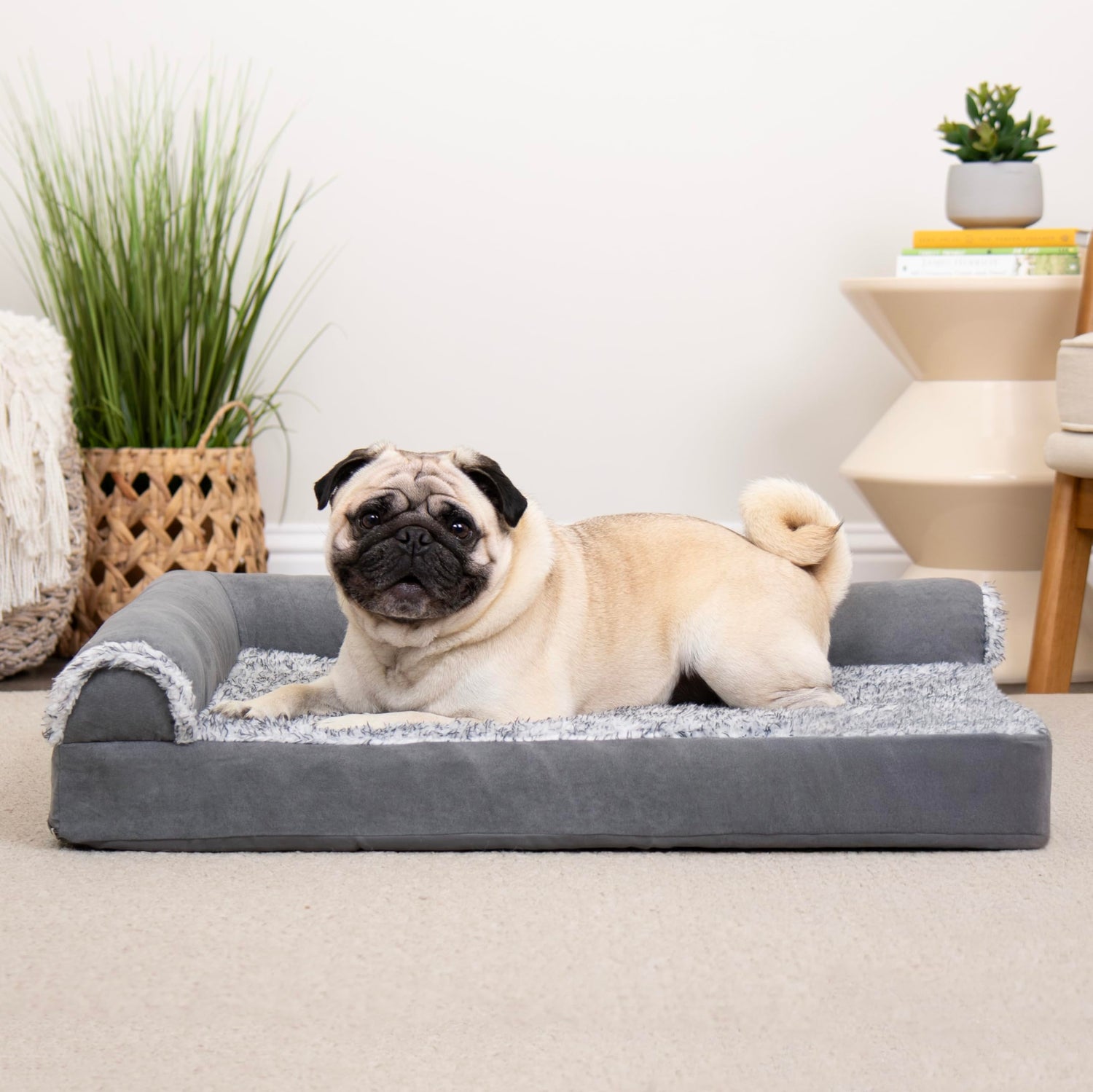 Details: Pamper your pet with a Furhaven Two-Tone Faux Fur & Suede L Chaise Dog Bed! A luxuriously soft faux fur sleep surface is complemented by suedine covered bolsters and gusset. Ultra-plush, flecked faux fur provides a snuggly soft sleep surface and trims the edges of the bolster for a chic flair. The two-tone design hides dirt and pet dander better than traditional plush sleep surfaces. The L-shaped bolsters support your petโ€™s back and hips, providing additional support. The L-shape also provides the perfect nook for pets that like to nest into comfort. The two raised, rounded bolster ends allow your pet to lay their paws or neck on the pillowed edge, helping to align the neck and spine. An orthopedic foam base features egg-crate foam that alleviates aching joints and provides soothing comfort to pressure points. The Jumbo Plus option, for larger breeds, features solid slab orthopedic foam for greater support and comfort. The zippered cover is easily removed and machine washable for your convenience. Available in various stylish colors and diverse sizing options so your pet can sprawl and lounge the day in maximum comfort and style. Easy to clean. Cover care: Remove from core before washing (see seam label for fabric care instructions). Foam care: Spot clean with mild soap; rinse. Blot, then air dry. Do not wring. Not for unsupervised use by animals with chewing behaviors.