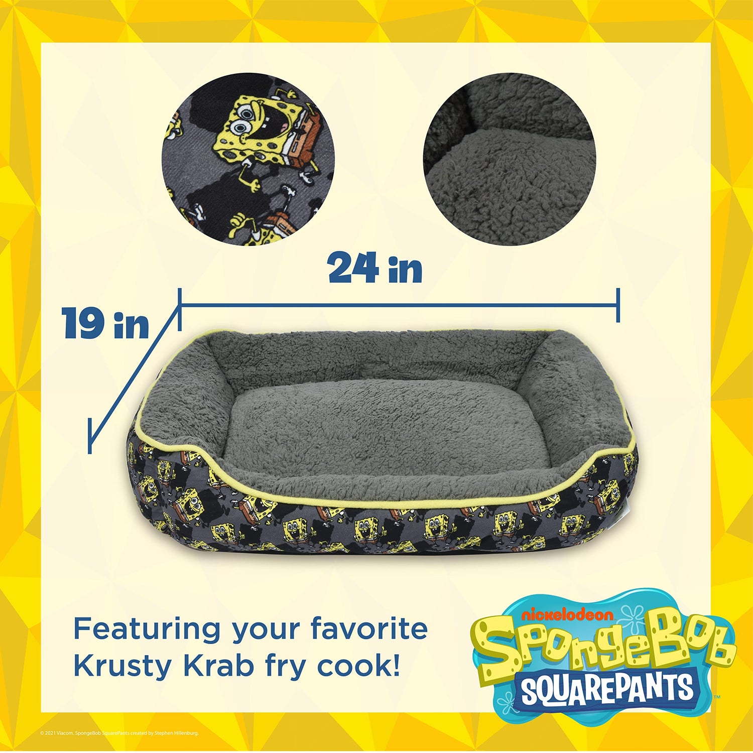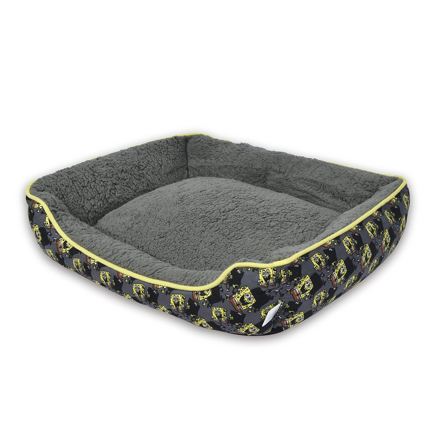 - SPONGEBOB SQUAREPANTS DESIGN: This dog bed features a repeating SpongeBob pattern on the outside, a bright yellow rim, and a grey interior