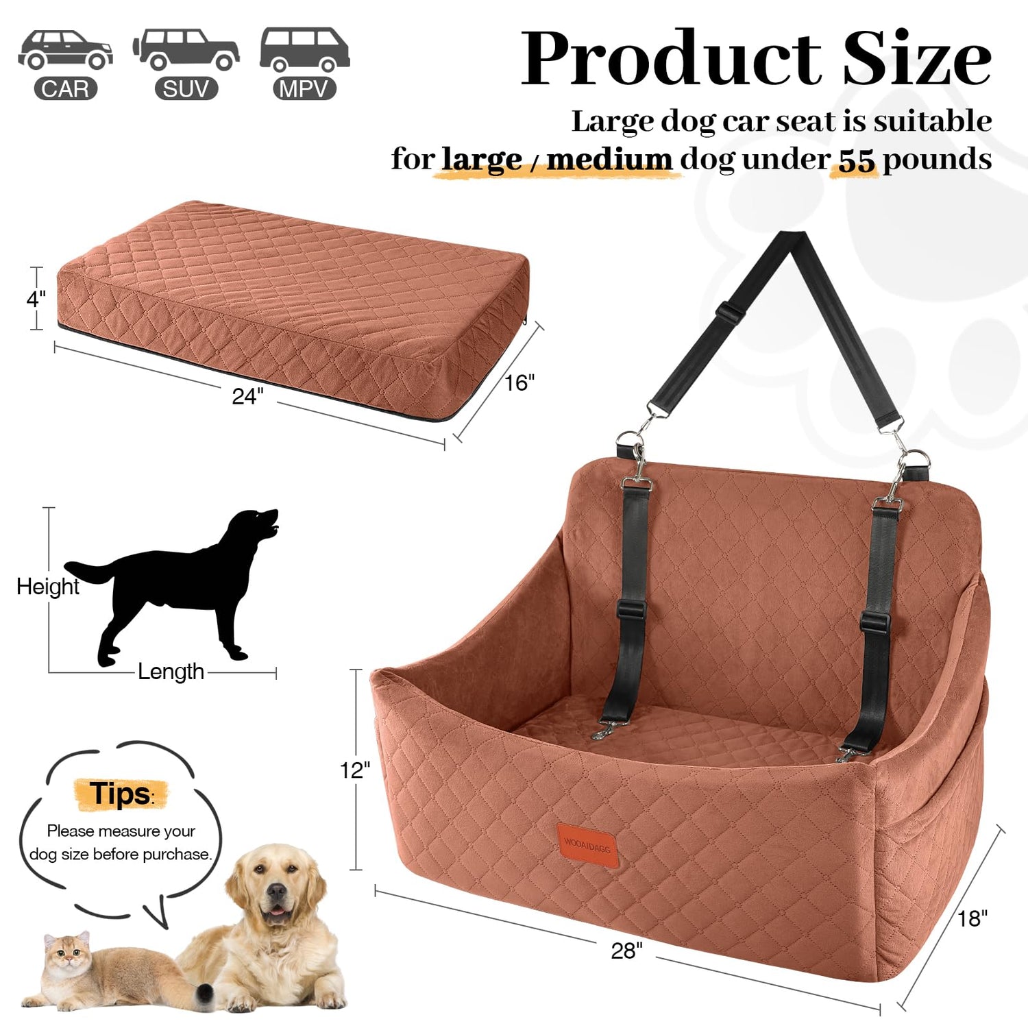 Wooaidagg Dog Car Seat for Medium & Large Dogs Up to 55lbs, Memory Foam Cushion, Washable Cover, Safety Straps & Non-Slip Base (Brown, Large)