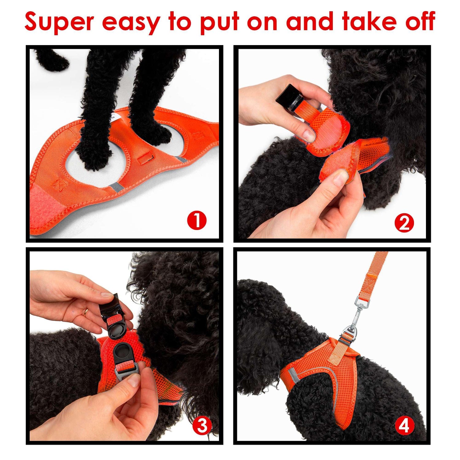 • [EASY TO USE] : Effortlessly slip this teacup dog harness on and off your pup in seconds. Simply (1) Put the pet's front legs in the step-in harness. (2) Pull the harness up and lock the buckle. (3) Buckle in and clip on to double D-rings.
