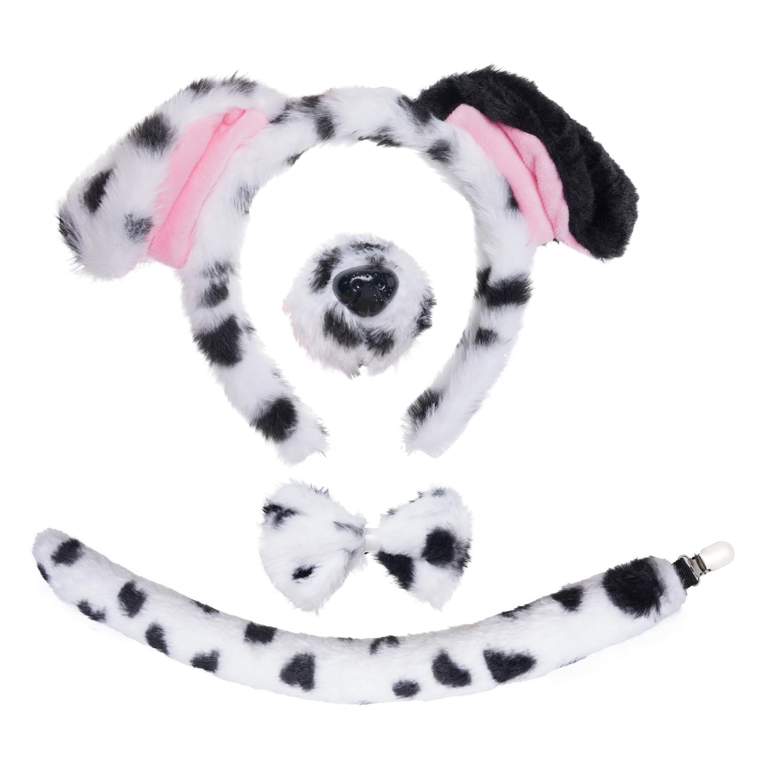 • Dalmatian Dog Costume Accessories: Package include 1 piece dalmatian ears headband, 1 piece dalmatian nose, 1 piece dalmatian tail, 1 piece bow tie. complete puppy dog costume for Halloween cosplay party favor.