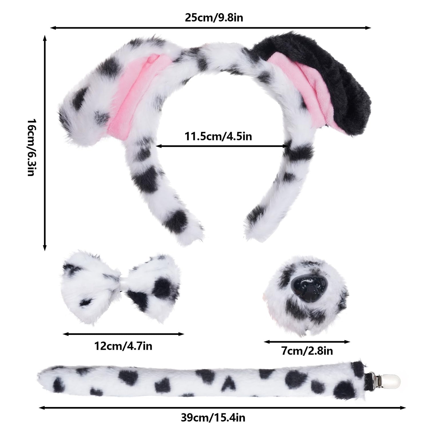 Complete Dalmatian Dog Costume: You will got 1 dog ears headband, 1 dog nose, 1 dog tail, 1 bowtie.