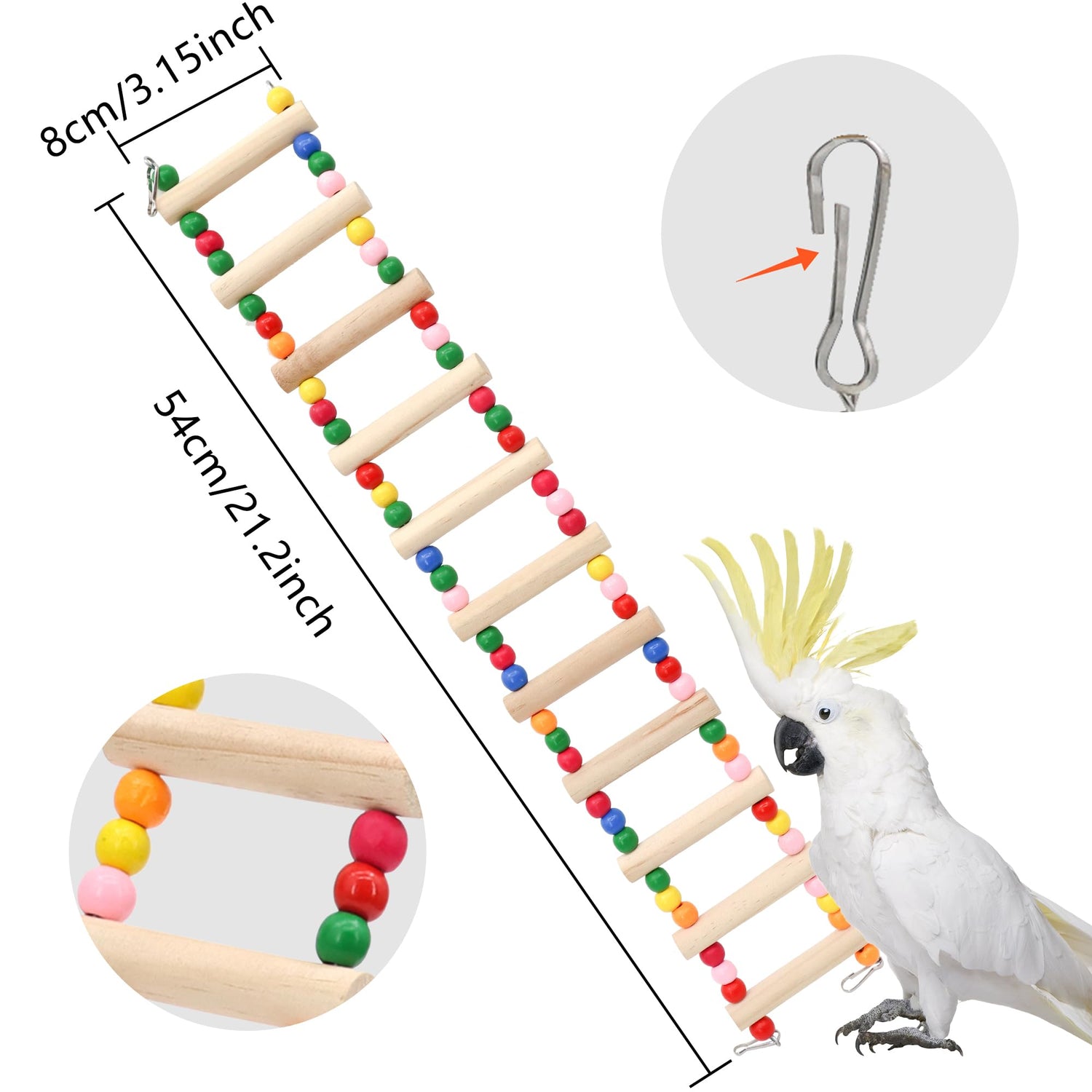 • Climbing and Swing Toys:The hanging wooden ladder bridge encourages birds to climb, play and hop from rung to rung. Develop Birds Balance.Provides pet birds a fun elevated place to swing, chew, climb.