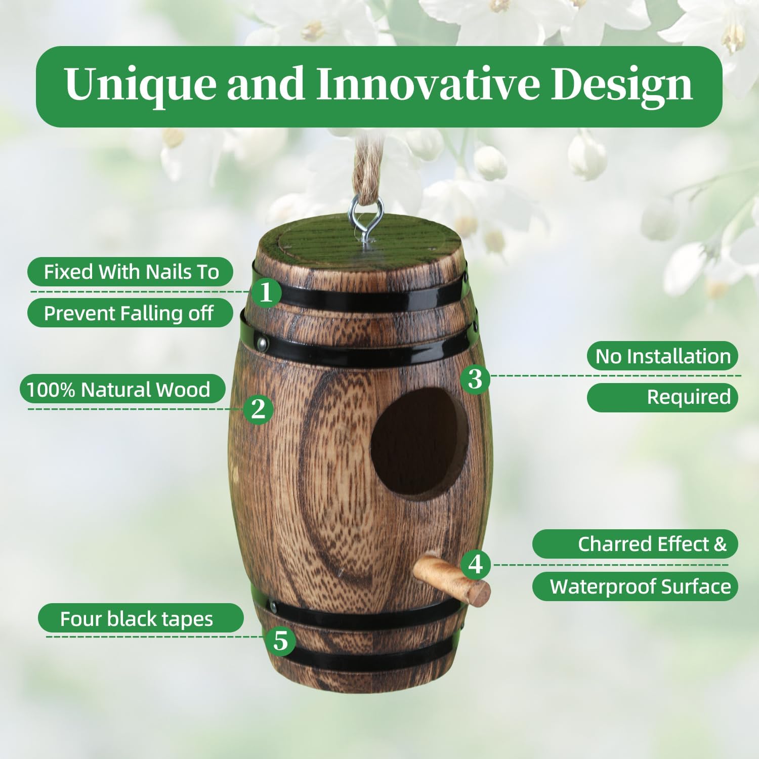 - 🐦【Drainage Hole Design & Waterproof】The Surface of This Hummingbird House is Carbonized and Waterproof, The unique and Novel Wine Barrel Shape Can Be used for Garden Decoration, Rain and Snow Weather Can also Keep The Appearance Dry. There are Drainage Holes at the Bottom to Prevent Rainwater Accumulation and Keep the nest dry.