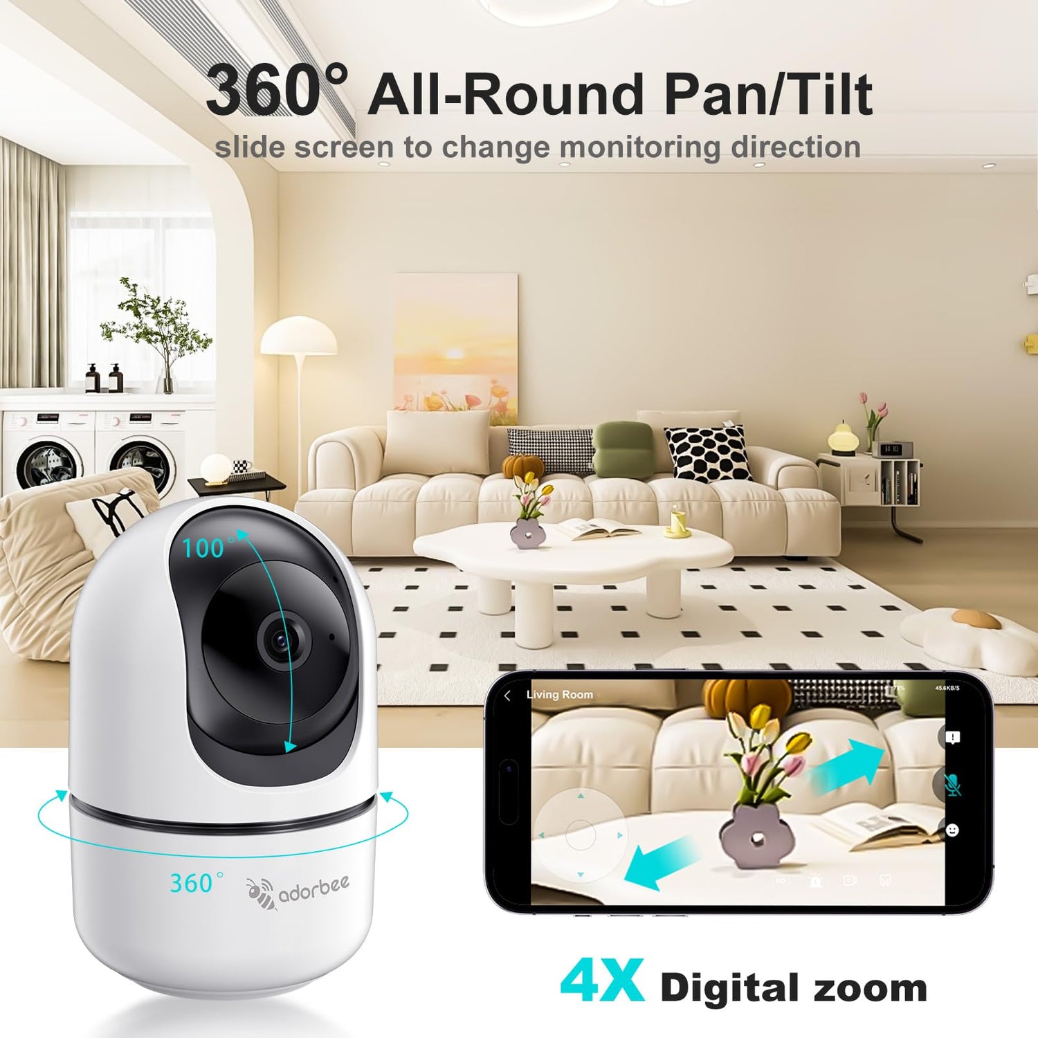 - 【2K HD & Pan/Tilt Camera】Adorbee indoor security camera equipped with 2K resolution optical lens offer ultra HD live streaming, allowing you to monitor your pet dog, baby, or elderly parents with clarity. With pan and tilt functions, the indoor camera provides a horizontal 360° and vertical 100° field of view. You can remotely control the camera on phone app, keeping an eye on every corner of your home, such as bedroom, living room, baby nursery, kitchen, playroom.