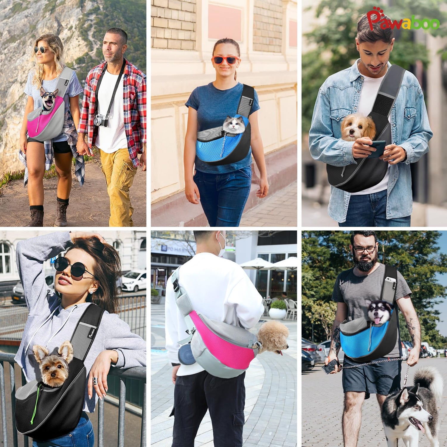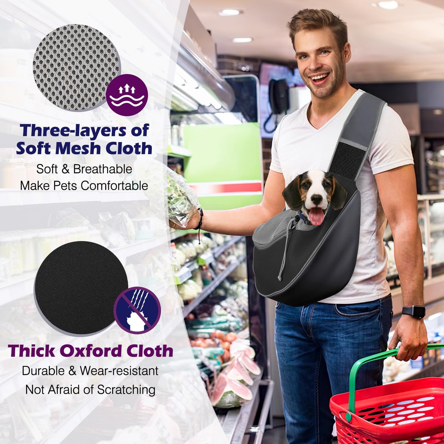- Safety: Made of oxford cloth and air mesh, this pet sling carrier is stretchy and provides cushioning protection for your pet. The drawstring prevents the dog from accidentally opening the zipper, while also preventing him from chewing the sling bag. Built-in safety collar hook, you can buckle it to the dog's collar or harness to prevent it from falling off.