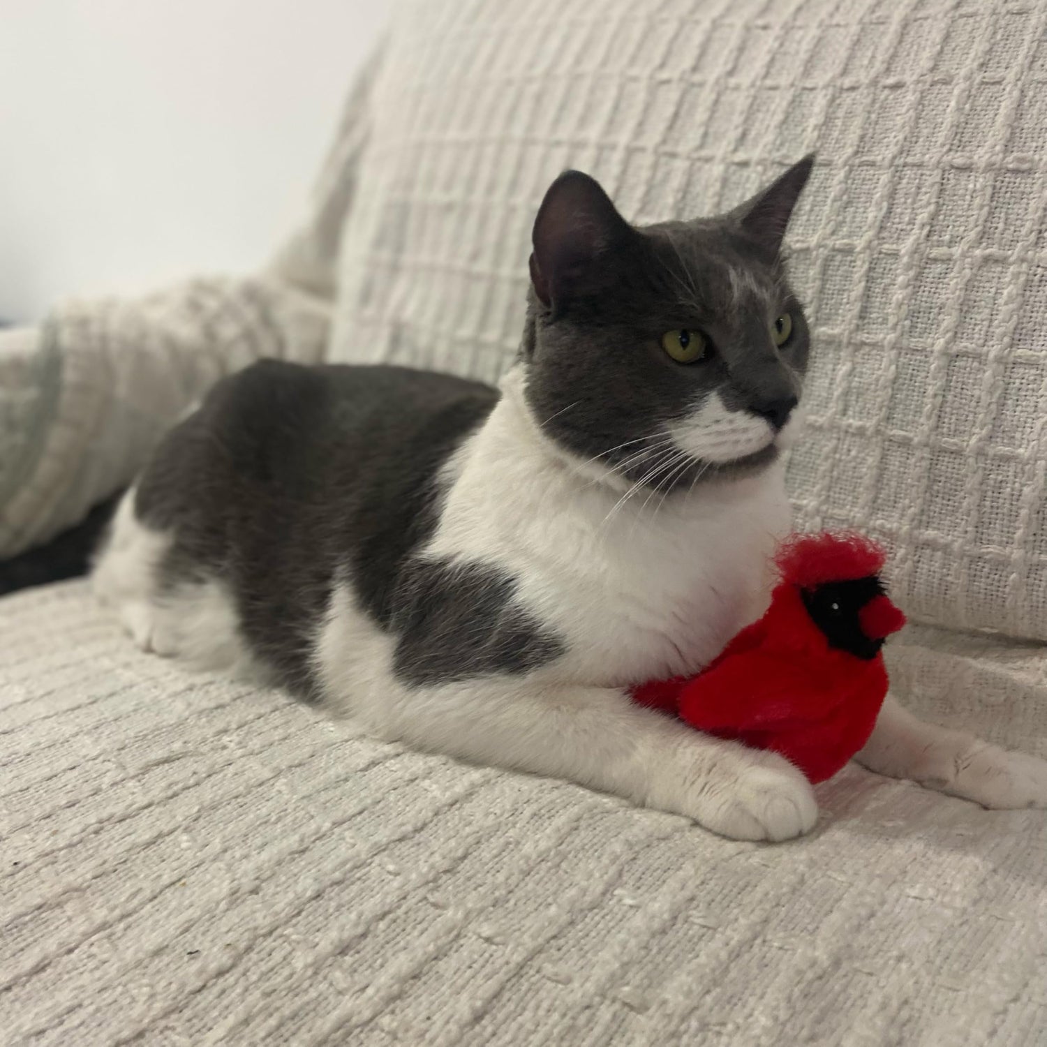Details: The SPOT Song Birds Catnip Cat Toy is a fun and interactive toy that is sure to excite your cat. The battery operated, motion activated toy mimcs the sounds of real songbirds. Song plays for 7 seconds and will restart if the toy is touched again. The catnip-filled plush toy will drive cats wild with excitement. The toy is fun to bat and chase, and indulges cats natural insticts to hunt and pounce. Provides good exercise and curbs destructive behaviors. Coin battery is not replaceable. Sound mechanism is securely sewn into the toy, without access.